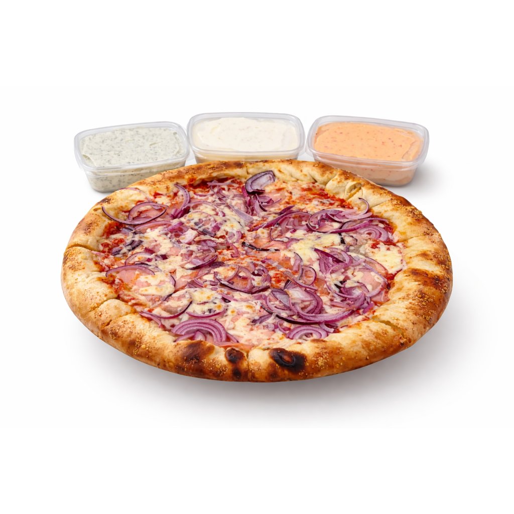(sýrové okraje, sugo, sýr, uzený losos, cibule, olivový olej)