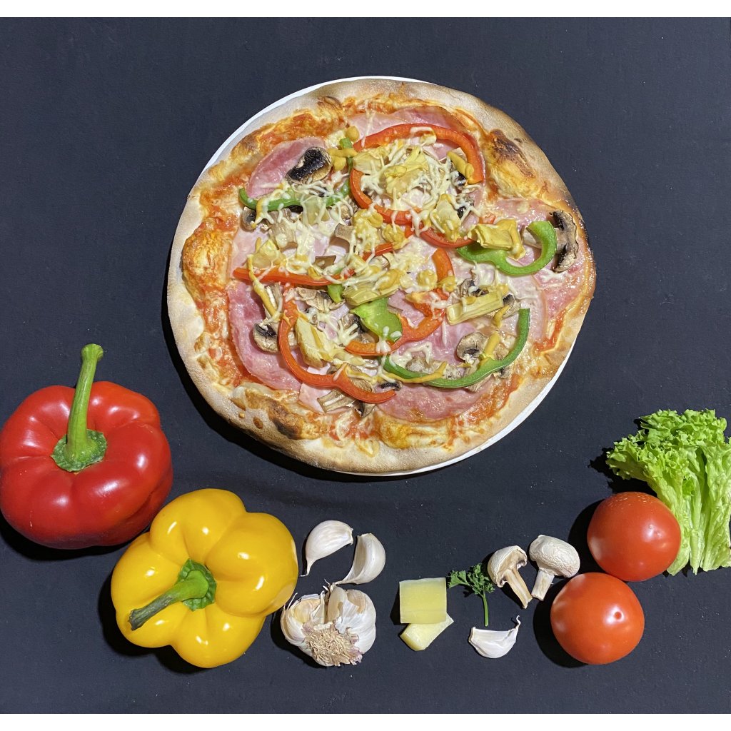 sugo, sýr, uzená krůtí rolka, šunka, paprika,hořčice, žampiony, artyčok, oregáno
