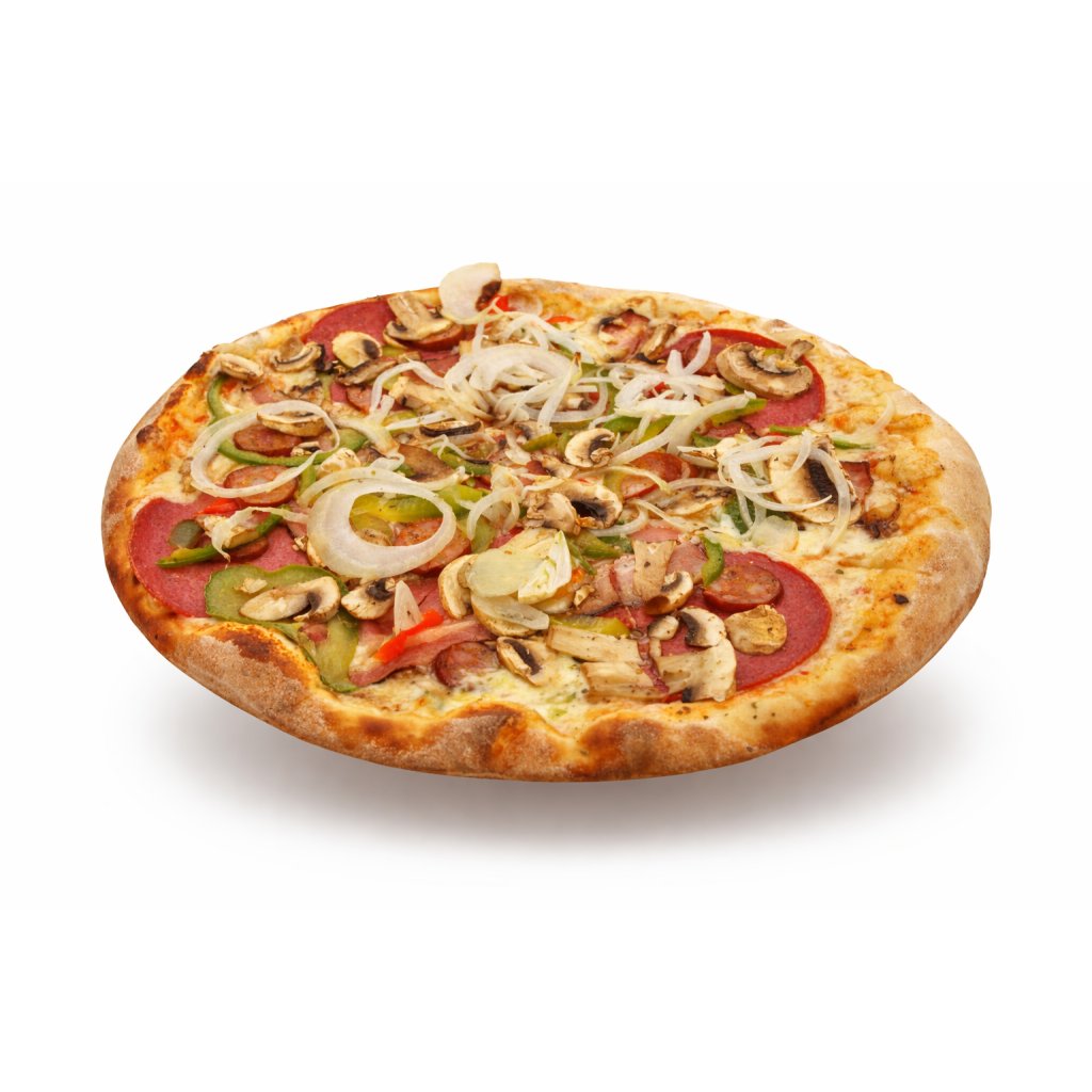 sugo, sýr, salám, slanina, klobása, paprika, žampiony, cibule
