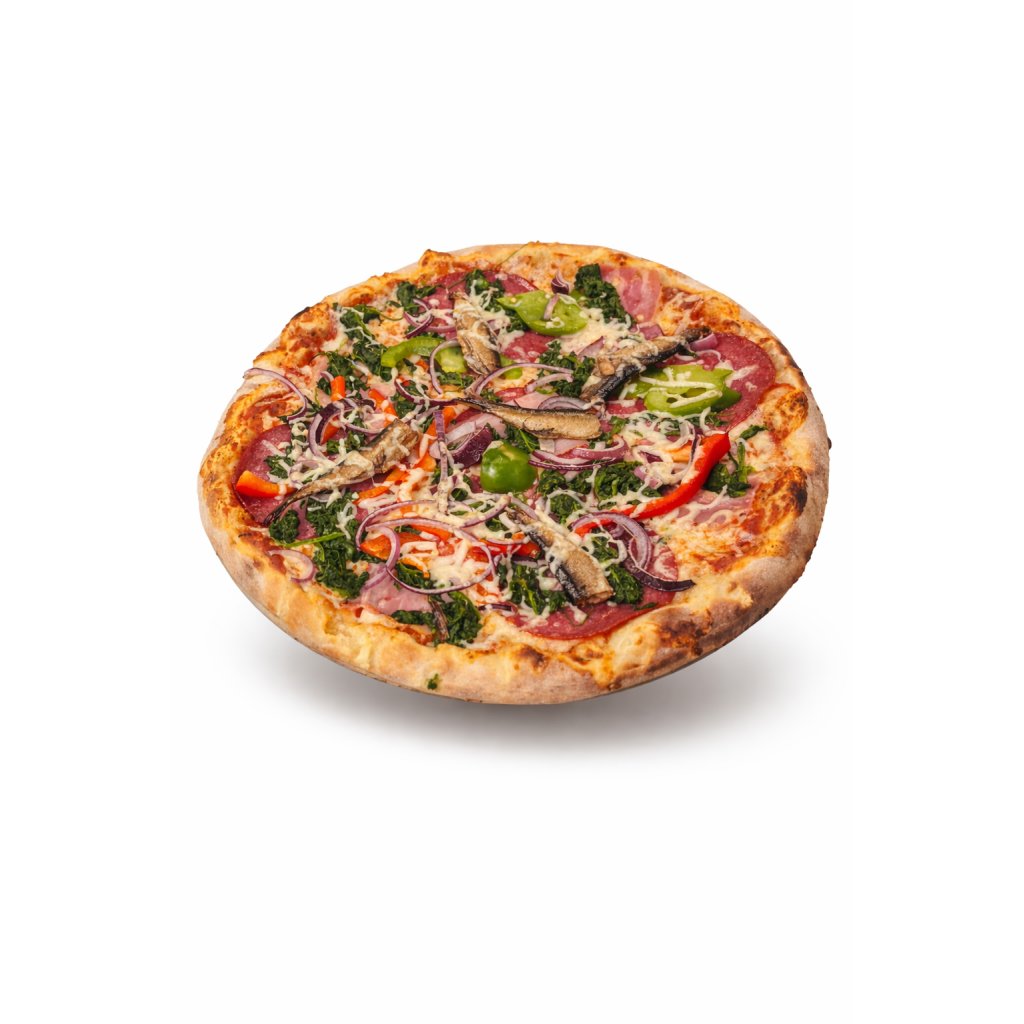 sugo, sýr, špenát, slanina, salám, šproty, paprika, cibule