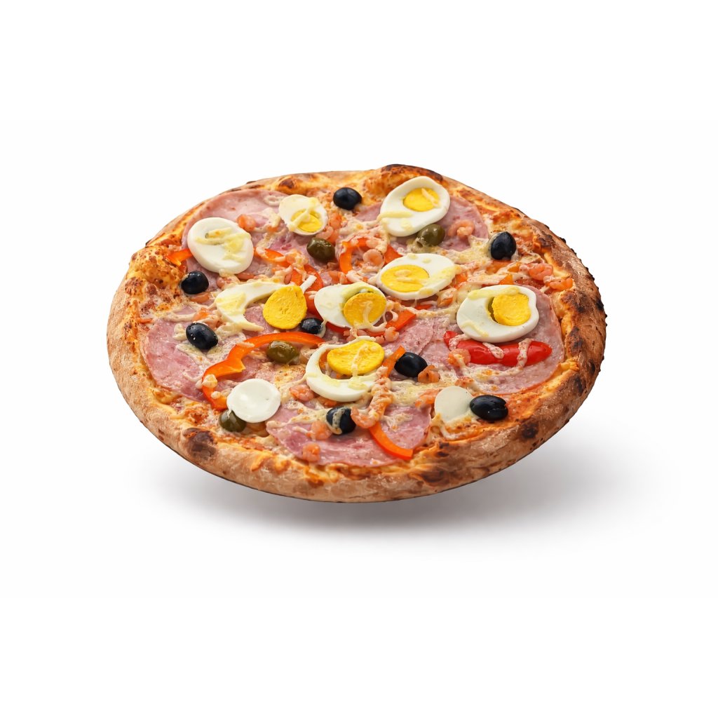 sugo, sýr, šunka, krevety, olivy, vejce na tvrdo, paprika