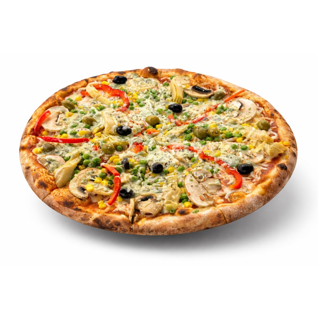 sugo, sýr, žampiony, kukuřice, hrášek, artyčok, paprika, olivy, niva