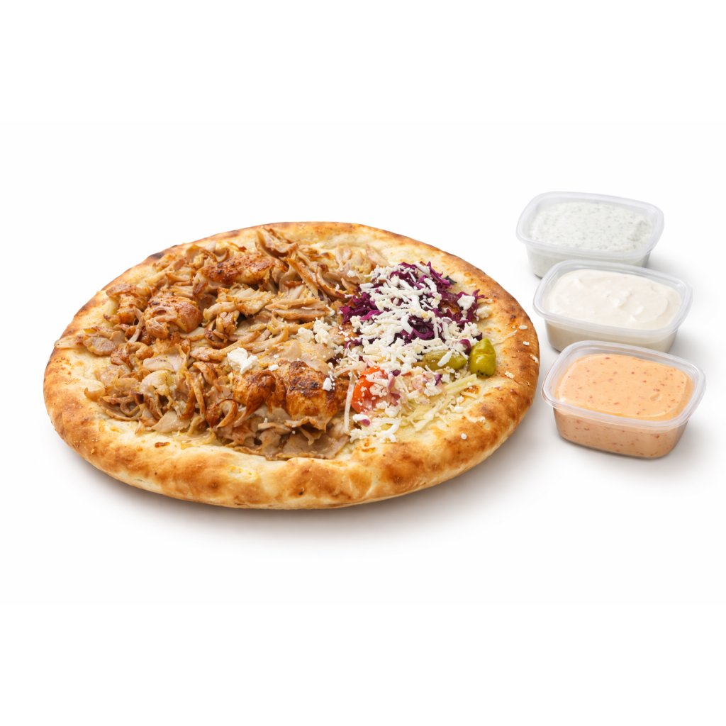 Kebab zapečený na těstě ze sýrovou omáčkou, maso, zelenina, česnekový bylinkový a palivý dresing